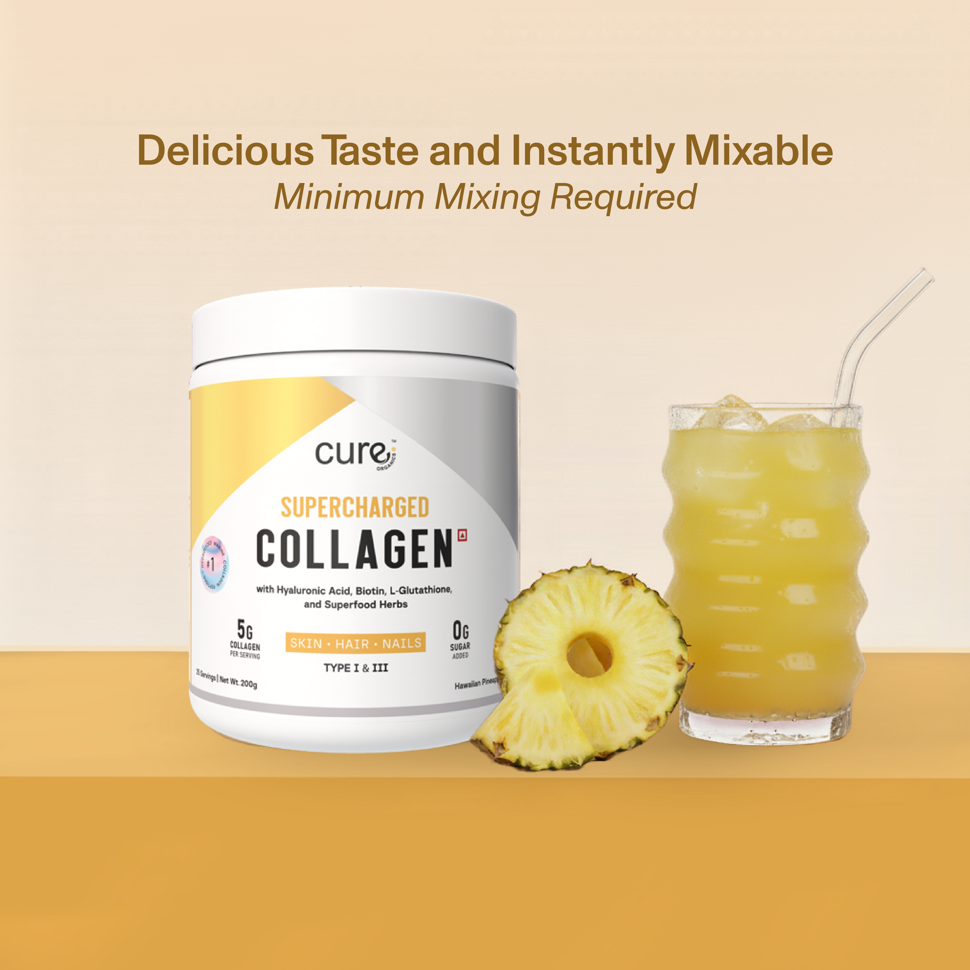 Meet India's #1 Taste-Good, Feel-Good Collagen: Supercharged Collagen by Cure Organics is arguably the tastiest marine collagen powder on the market, without compromising on performance or health. Rather, following our “Simply Higher Ingredient Standards” helps us deliver more in every scoop – more glow wellness benefits, more flavour, and more nutrition. Powered by premium quality marine collagen peptides that are hydrolyzed for better absorption, Supercharged Collagen makes for the perfect, dessert-worthy addition to your day.